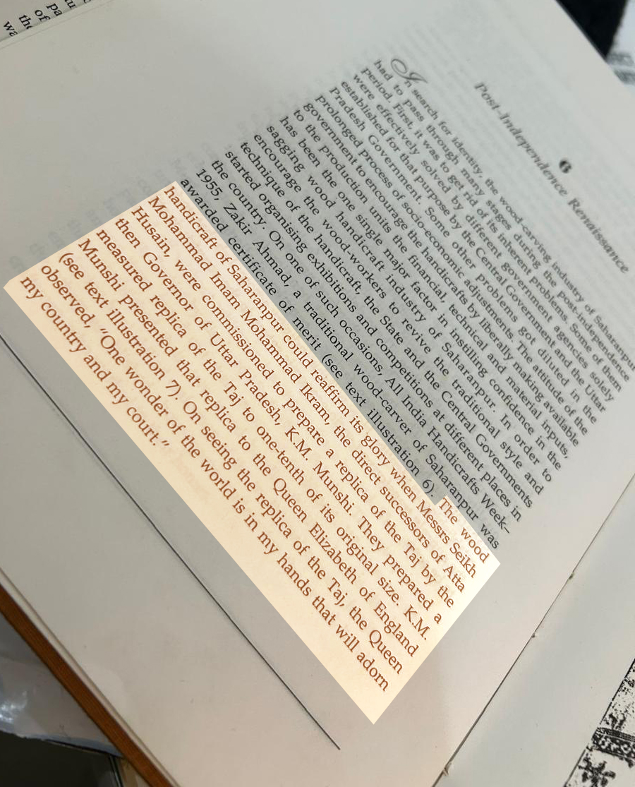 ,On Seeing the replica of the Taj, the Queen Observed “One Wonder of the world is in my hands that will adorn my country and my court” ‘. This is mentioned in book called ‘Wood Handicraft – A study of its origin and Development in Saharanpur’ by Mr O.C. Handa and Ms Madhu Jain. Event mentioned when Governer of Uttar Pradesh presented the ‘Replica of Taj Mahal’ to Queen Elizabeth prepared by our forefathers.